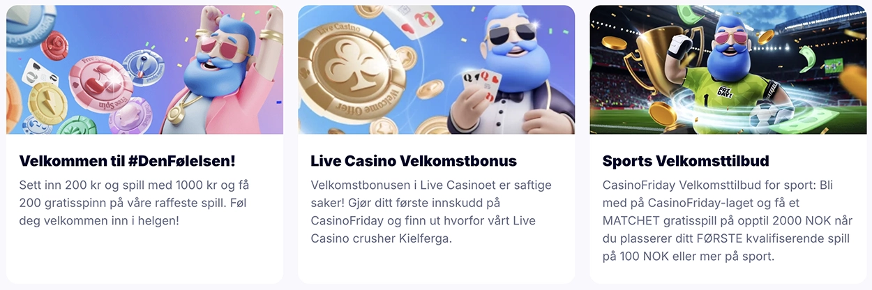 | Casino Friday | 100% non-sticky bonus opptil 5 000 kr + 200 gratisspinn | Min. innskudd: 200 kr · Omsetning: 40x · Spinn fordeles over 10 dager | Hent Bonus Her! |